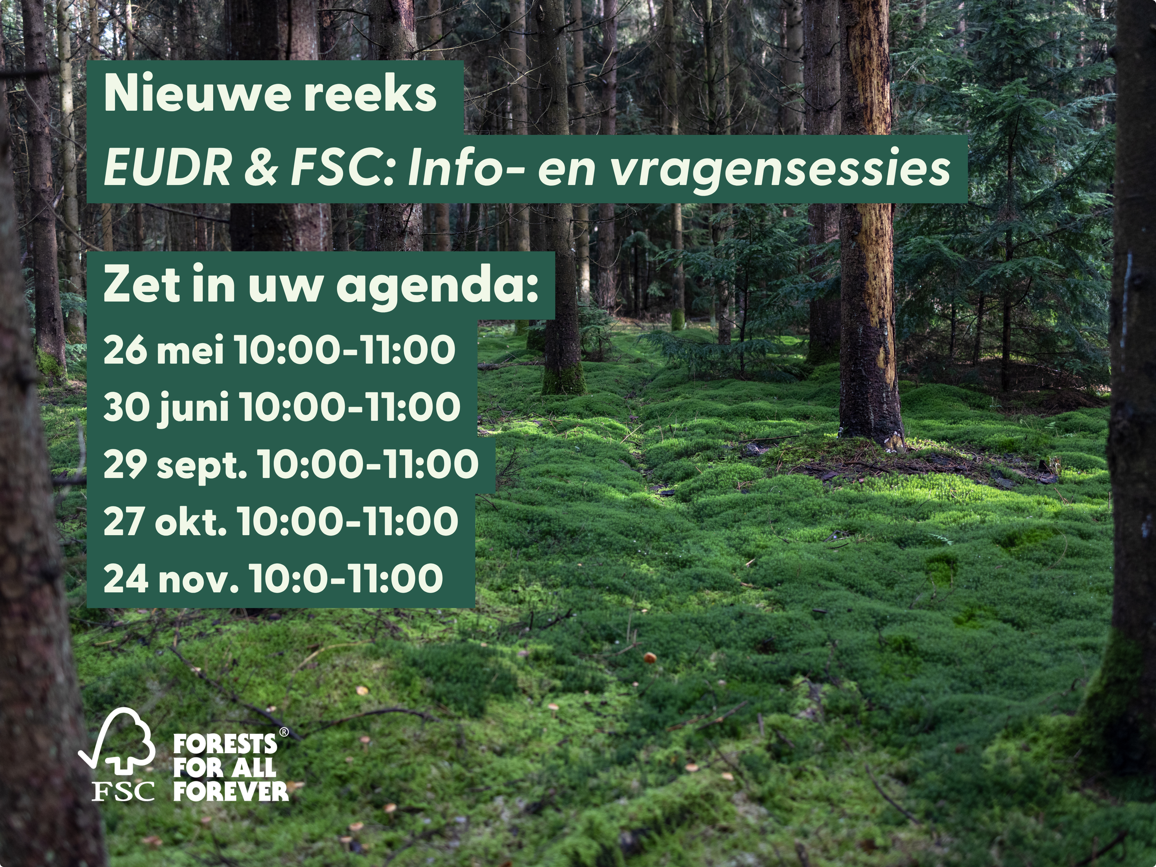 Eind april maakt de Europese Unie bekend hoe de EUDR er definitief uit komt te zien en welke vereenvoudigingen worden doorgevoerd. Naar aanleiding daarvan organiseert FSC Nederland opnieuw maandelijkse EUDR – FSC informatie- en vragensessies. Deze sessies zijn bedoeld om organisaties te ondersteunen bij de voorbereidingen op de nieuwe regelgeving.