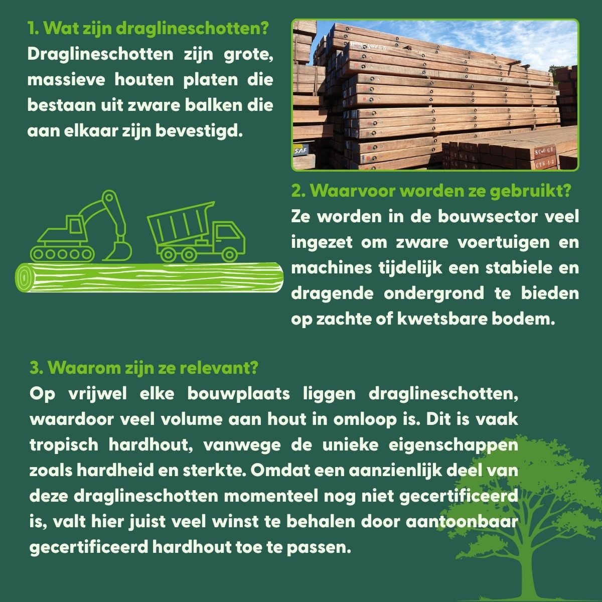 Het gebruik van draglineschotten van duurzaam geproduceerd, FSC-gecertificeerd hardhout blijft in Nederland nog achter. Voor deze schotten worden vaak tropische hardhoutsoorten toegepast, voornamelijk Azobé, maar ook soorten als Dabéma en Okan. Dit hout is veelal afkomstig uit West‑Afrika. Hoewel FSC-gecertificeerd hardhout beschikbaar is, blijft de vraag naar gecertificeerde dragline schotten nog beperkt.
